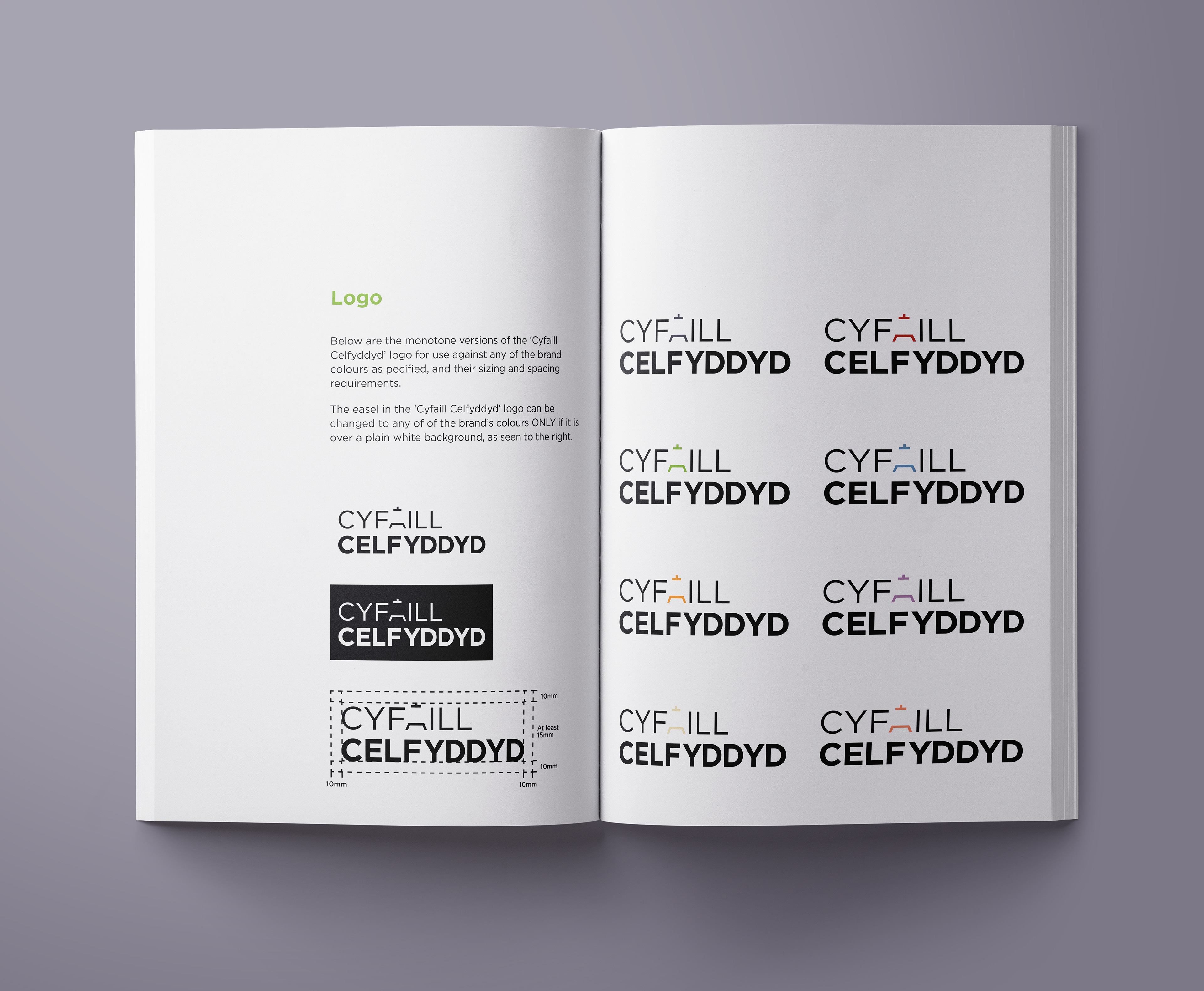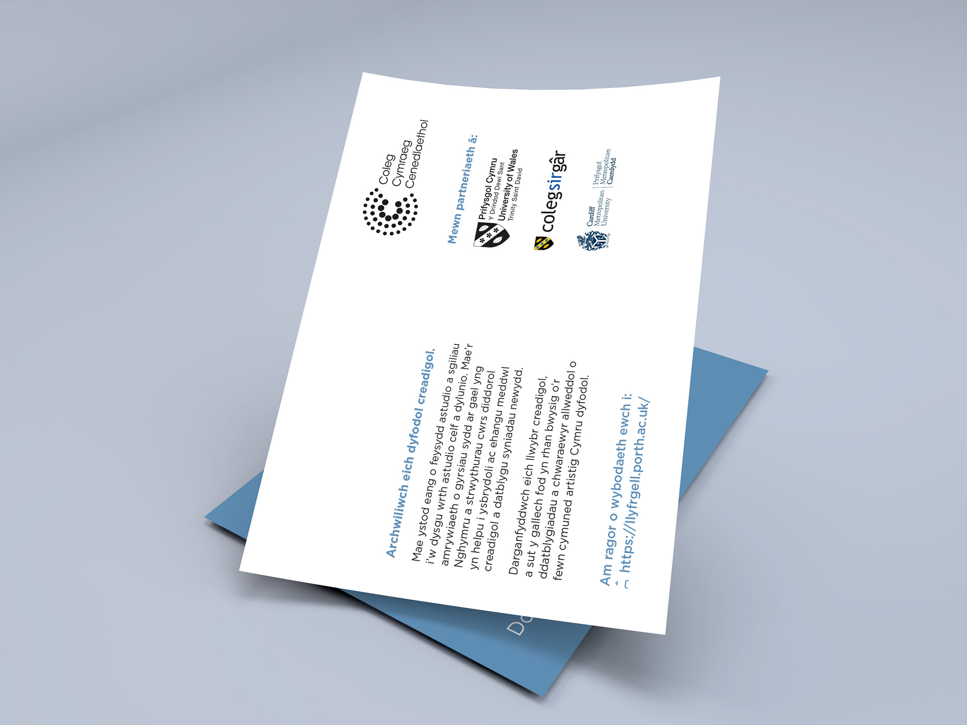 The branding concept for a Welsh language art support resource, developed in collaboration with Coleg Cymraeg Cenedlaethol, UWTSD, Cardiff Met University, and Coleg SirGar. This includes brand guidelines and an A6 promotional flyer.